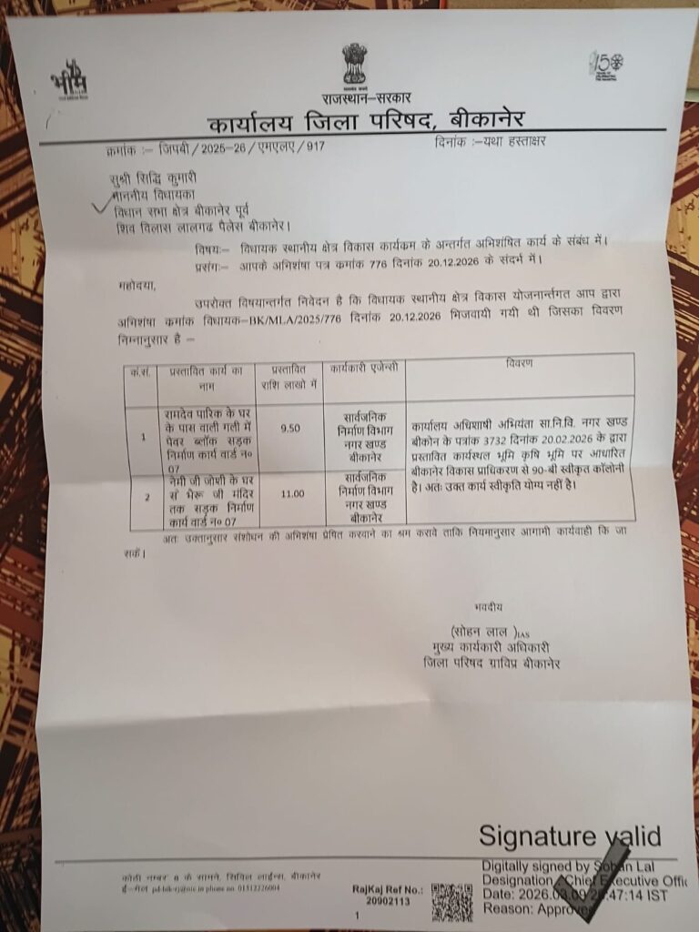 साथ ही प्रतिनिधिमंडल ने पूर्व क्षेत्र के ग्रामीण इलाके उदय रामसर में विधायक एवं सांसद कोटे से स्वीकृत लंबित विकास कार्यों को भी जल्द स्वीकृति देने की मांग की. प्रतिनिधिमंडल ने विशेष रूप से सड़क निर्माण, श्मशान भूमि की चारदीवारी तथा अन्य जनहित के कार्यों को प्राथमिकता के आधार पर स्वीकृत करवाने का आग्रह किया. सीईओ ने प्रतिनिधिमंडल को आश्वस्त किया कि सभी विषयों पर नियमानुसार शीघ्र परीक्षण कर आवश्यक कार्यवाही की जाएगी. इस अवसर पर गंगाशहर मंडल अध्यक्ष प्रकाश मेघवाल, पूर्व मंडल अध्यक्ष जेठमल नाहाटा, मंडल महामंत्री गोविंद सारस्वत तथा जसकरण मारू सहित अन्य कार्यकर्ता उपस्थित रहे.